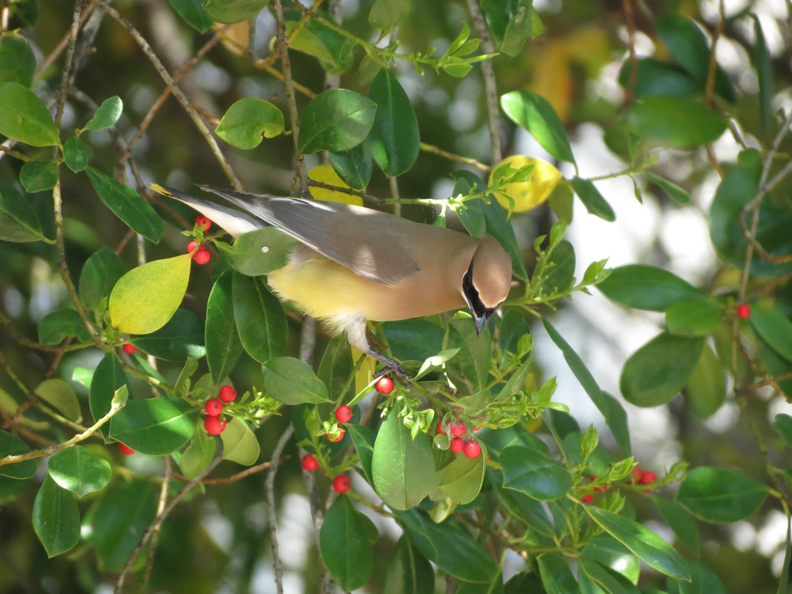 Around Campus I ran into quite a flock of Cedar Waxwings while walking out to my car one afternoon. I just happened to have my camera on me. The Mockingbird was none-to-thrilled about the visitors.